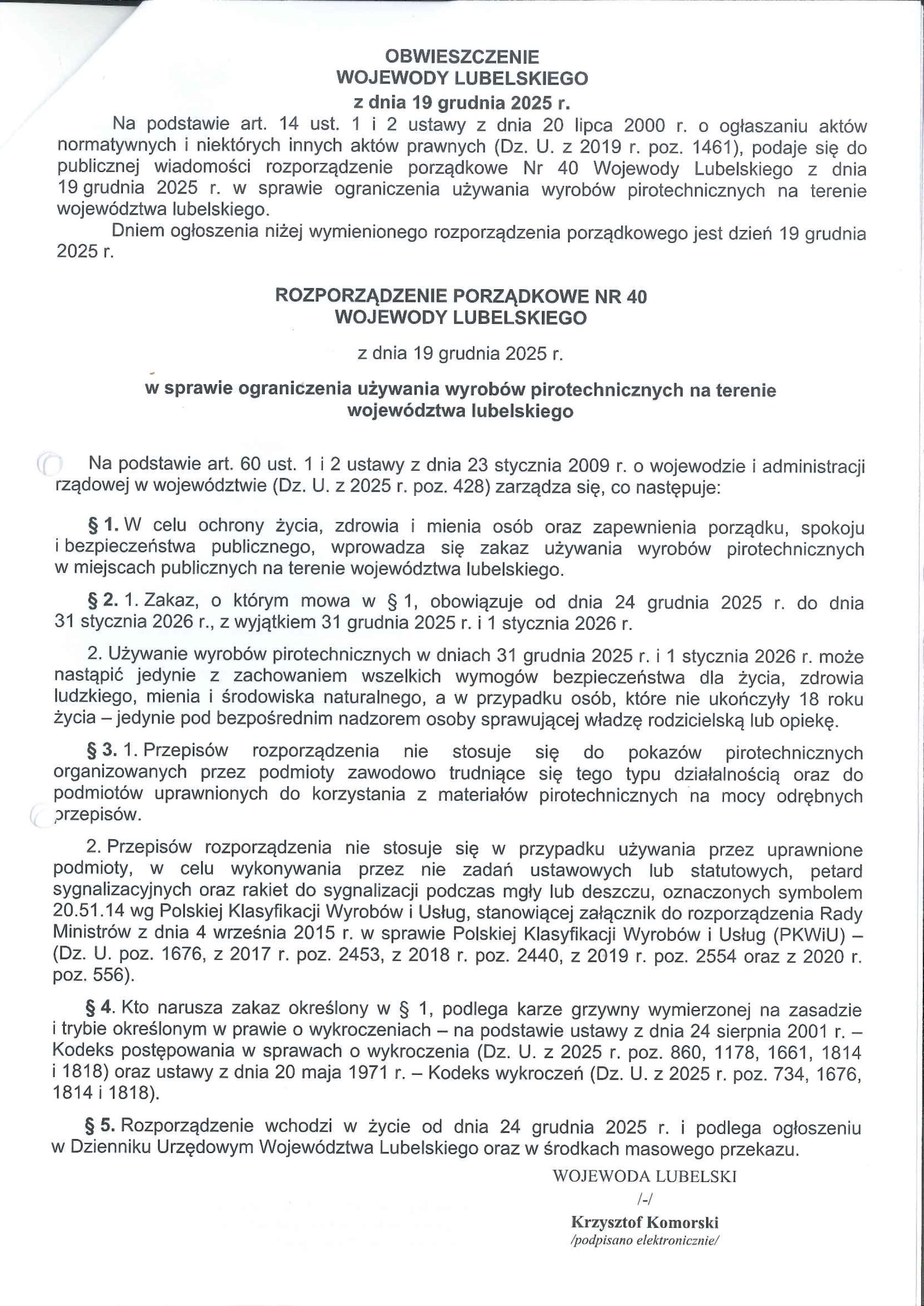 OBWIESZCZENIE WOJEWODY LUBELSKIEGO w sprawie ograniczenia używania wyrobów pirotechnicznych na terenie województwa lubelskiego