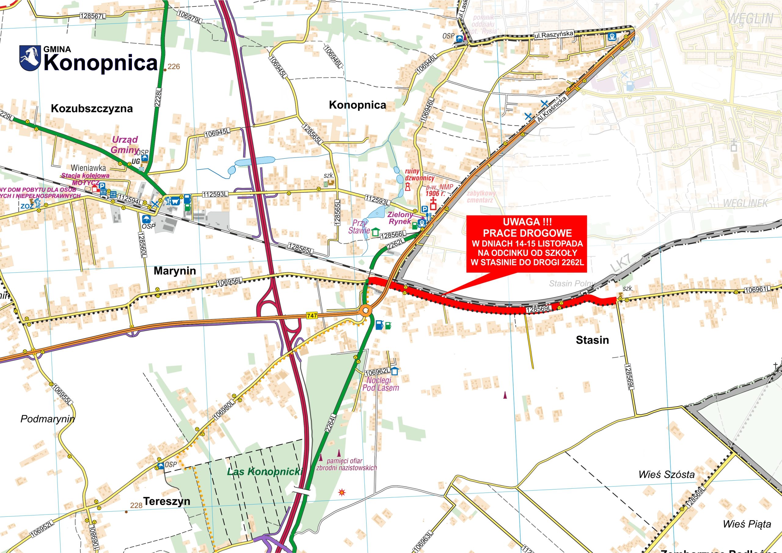 Informujemy, że w dniach 14-15 listopada w związku z pracami drogowymi na odcinku od szkoły w Stasinie do drogi 2262L będą występować utrudnienia.
