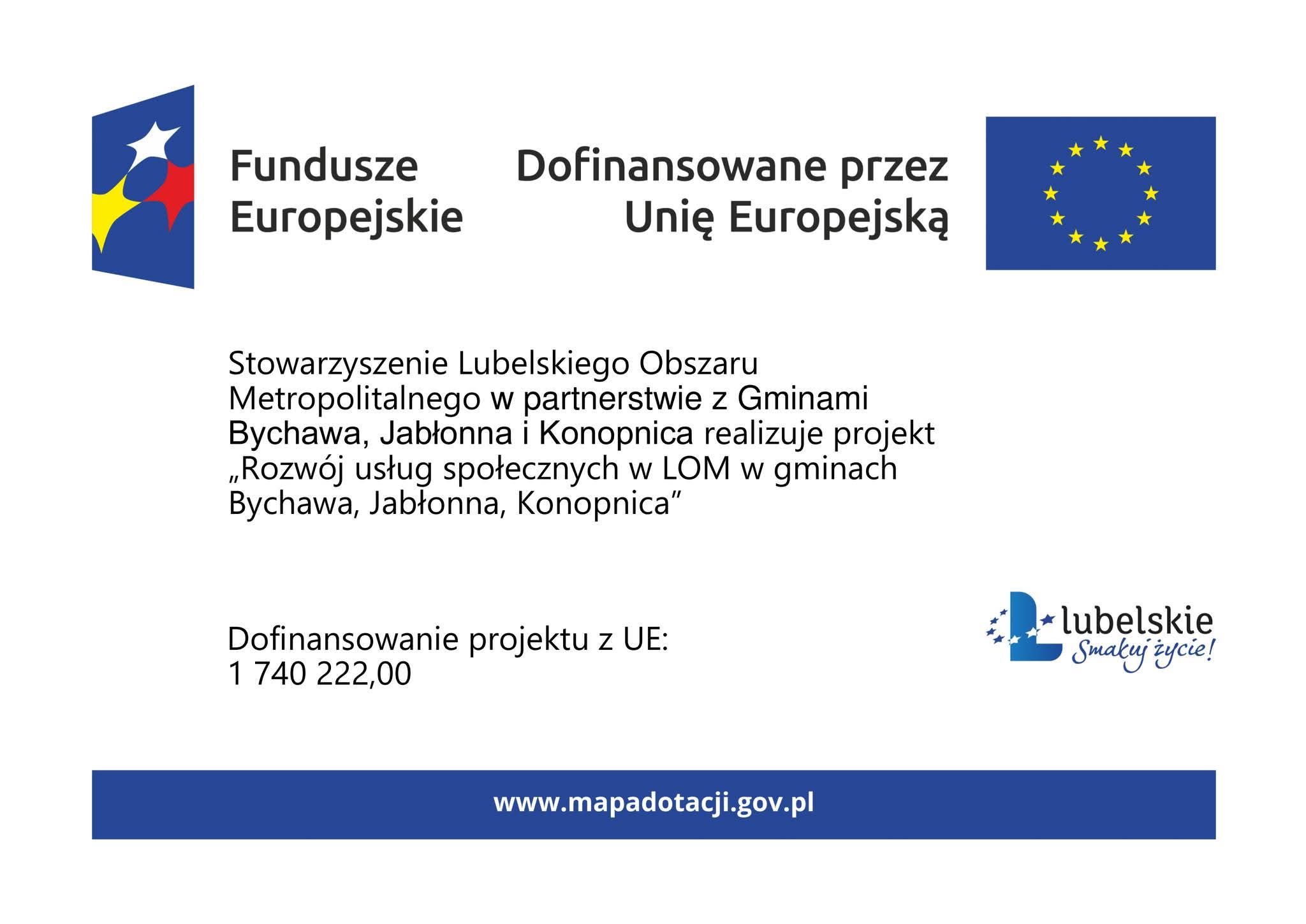Projekt „Rozwój usług społecznych w LOM w gminach Bychawa, Jabłonna, Konopnica” nr FELU.08.07-IZ.00-0002/25, współfinansowany ze środków Europejskiego Funduszu Społecznego Plus w ramach Działania 8.7 Usługi społeczne w ramach Zintegrowanych Inwestycji Terytorialnych (typ projektu 1 a-f, 2, 3, 4) Priorytetu VIII Zwiększanie spójności społecznej programu Fundusze Europejskie dla Lubelskiego 2021-2027