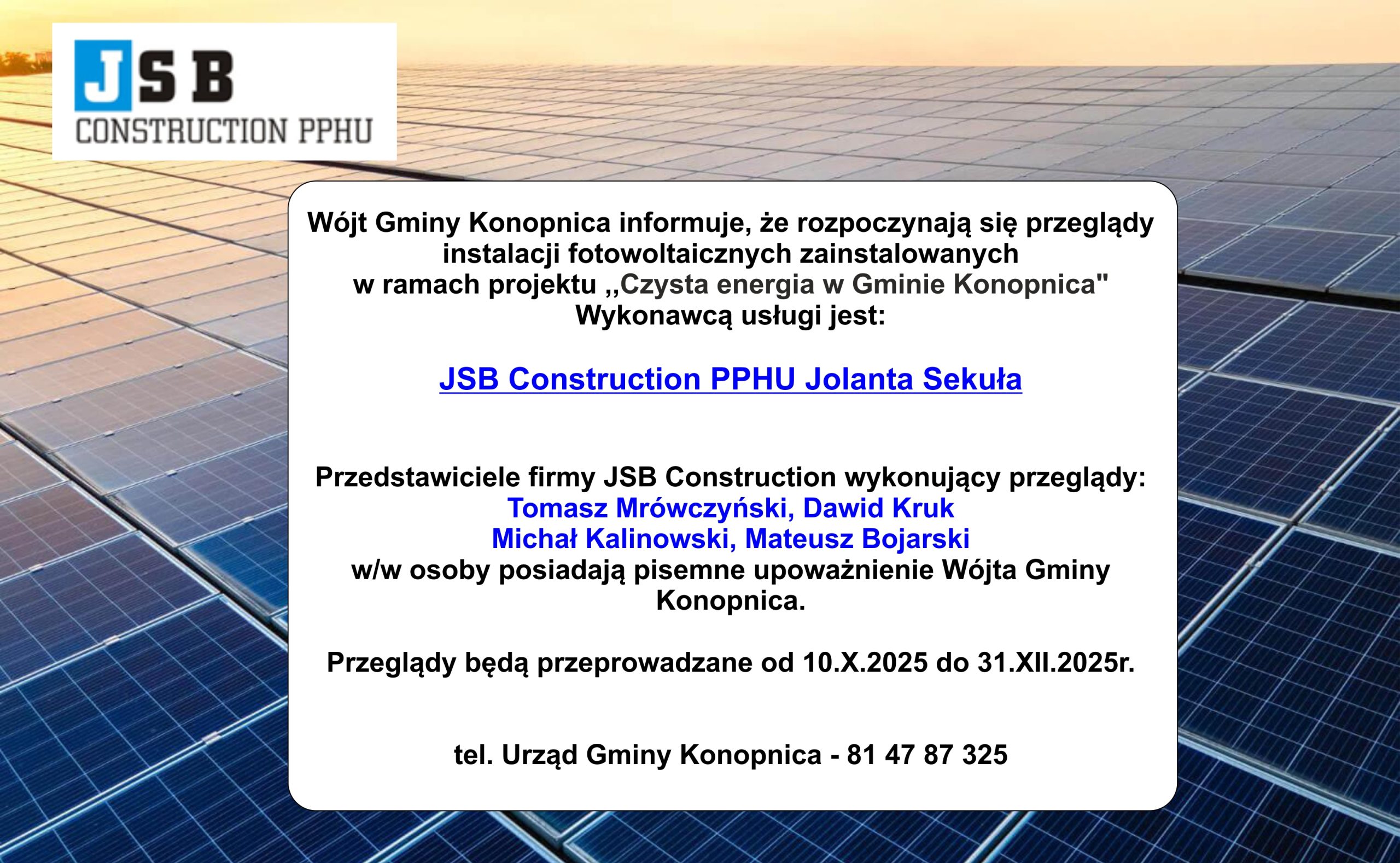 Wójt Gminy Konopnica informuje, że rozpoczynają się przeglądy instalacji fotowoltaicznych zainstalowanych